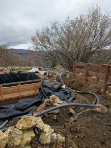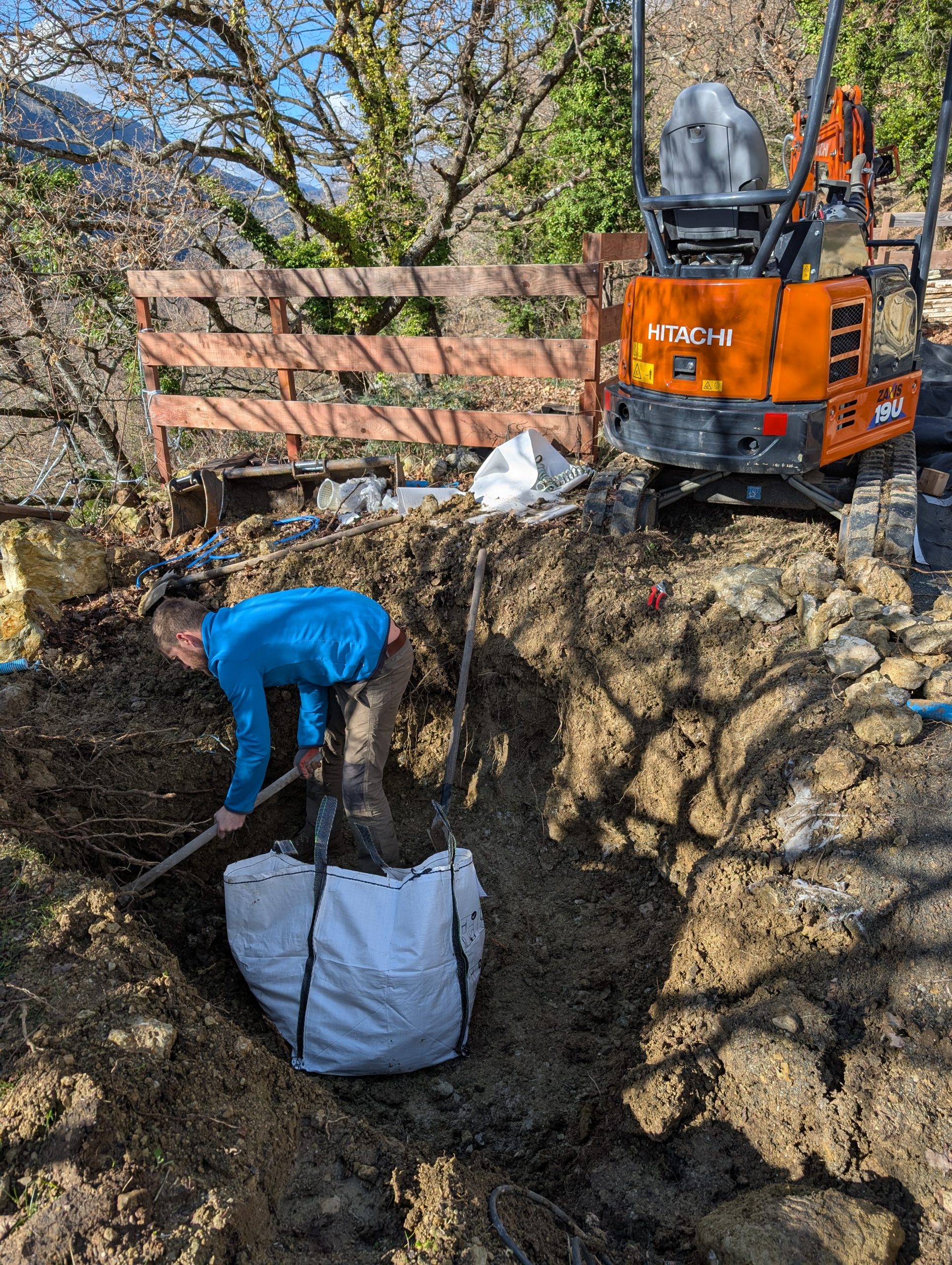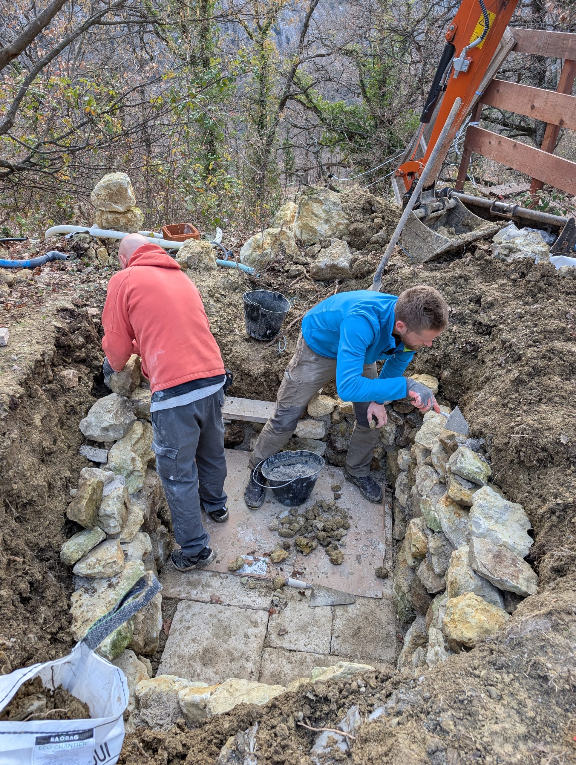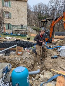 La piscine naturelle avance bien avec la mise en place de la filtration… Grosse partie, grosses sueurs mais ça devrait le faire💪😅